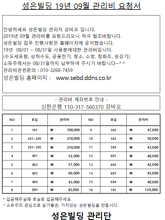 19년 9월 관리비 요청 문자송부했습니다. 페이지 정보 작성자 강비오 댓글 0건 조회 119,860회 작성일 19-09-26 10:42 목록 본문 적극적인 협조부탁드립니다. 댓글 0 댓글목록 등록된 댓글이 없습니다.