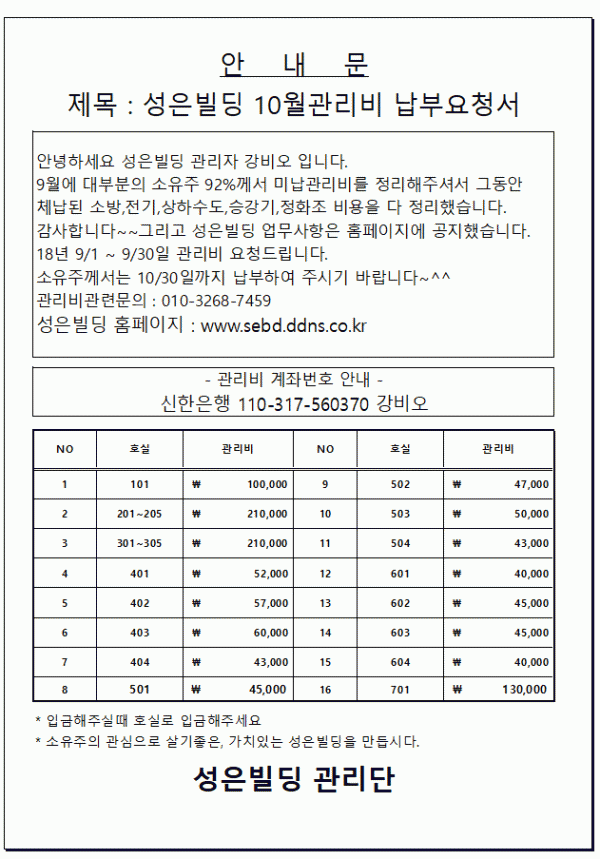 2018년 10월 관리비 고지서 문자송부했습니다. 페이지 정보 작성자 강비오 댓글 0건 조회 140,026회 작성일 18-10-25 18:24 목록 본문 소유자님들의 적극적인 협조부탁합니다~ 댓글 0 댓글목록 등록된 댓글이 없습니다.